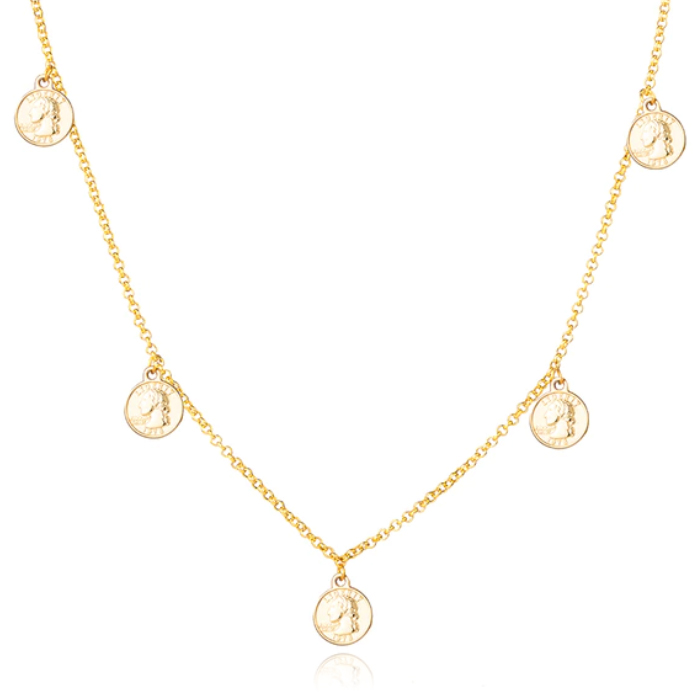 Aan de ketting zijn 5 losse muntjes bevestigd.