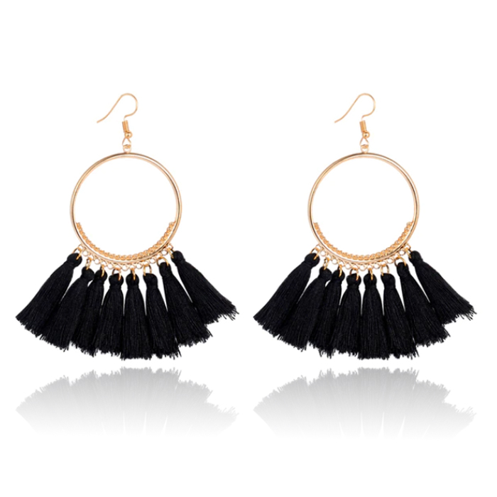 Goudkleurige oorbellen van het merk LGT JWLS. De oorbellen hebben een cirkelvormige basis met daaronder zwarte kwastjes.