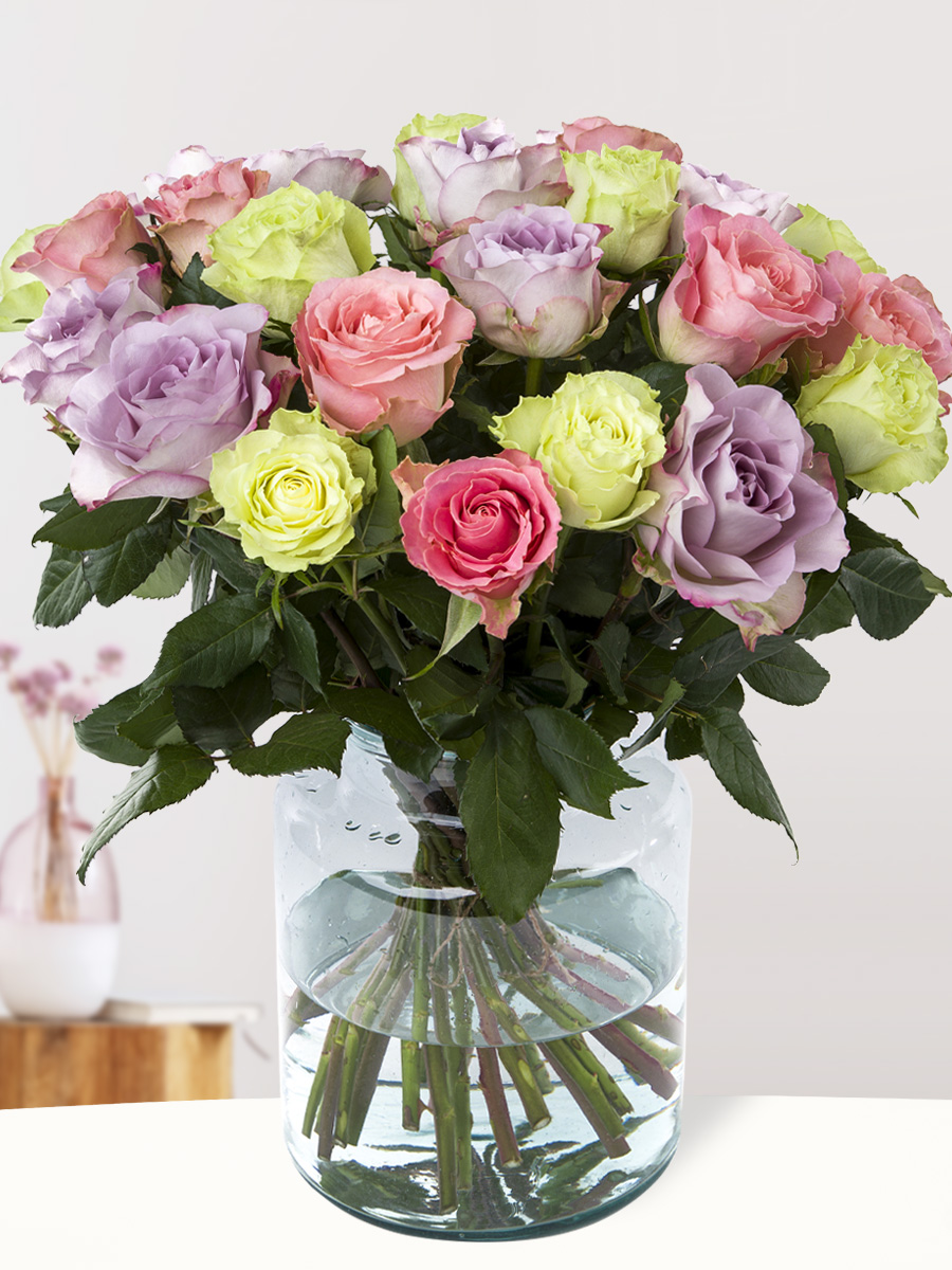 De rozen in dit boeket zijn van de verschillende soorten Memory Lane, Hermosa en Camouflage. Deze verschillende rozen worden door de verschillende kwekers Altima, Mount Kenia Roses en Rift Valley Roses voor Surprose gekweekt en zijn allen afkomstig uit Kenia. De steellengte van deze rozen is ongeveer 50 centimeter, waardoor dit boeket op elke passende vaas goed tot zijn recht komt. Ben je benieuwd naar de verschillende rozen in dit boeket? Vul dan even de verschillende soorten één voor één in de zoekbalk in en laat je verrassen door de verschillende boeketten die wij in ons ruime assortiment aanbieden met deze rozen, zoals bijvoorbeeld dit boeket met enkel Memory Lane rozen (). Bestel nu dit boeket bij Surprose en geniet van haar speelse en rustgevende uitstraling of verzend dit boeket en geef een prachtig cadeau. Vergeet hierbij niet jouw persoonlijke wenstekst in te vullen om te laten weten van wie en waarom dit mooie boeket rozen wordt bezorgt.