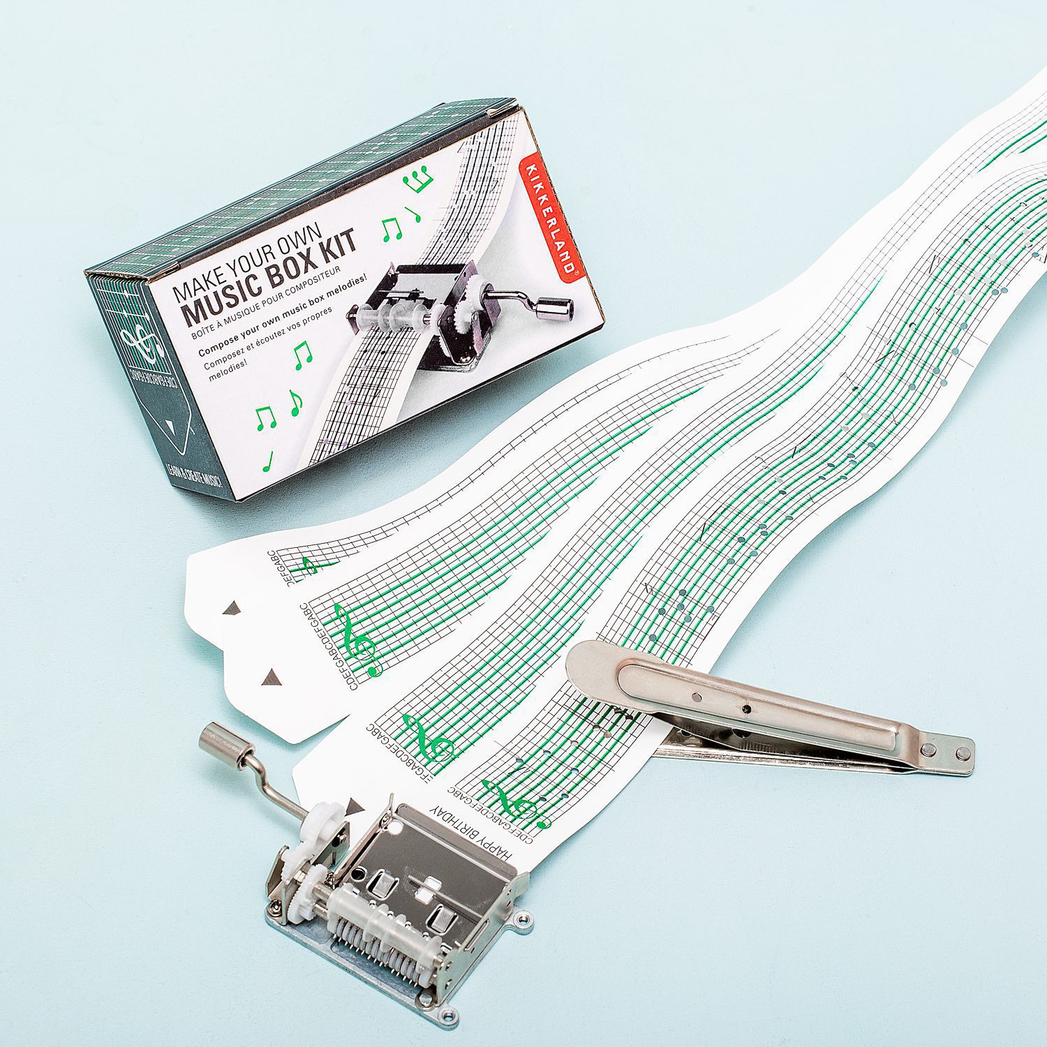 Maak zelf muziek met het Maak je eigen muziekdoosje van Kikkerland. Voortaan kun je het muziekdoosje je eigen bedachte melodietjes laten afspelen. In de verpakking vind je verschillende stukken papier, een gaatjesmaker en een papiertje waar het melodietje van Happy Birthday op staat. Door gaatjes in de papieren strips te maken, kun je een eigen liedje creëren. Geef de zwengel een zwaai en jouw muziek is door de hele ruimte te horen.