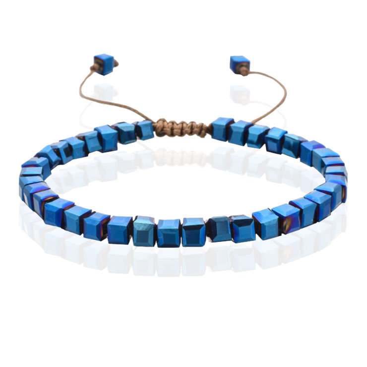 De armband is versierd met kralen van kristal glas in de kleur donker blauw, die in de vorm van kubussen zijn geslepen.