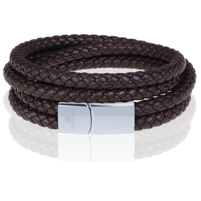 Memphis dubbele leren wrap armband voor mannen. Deze lederen armband is van Nederlandse bodem en volledig met de hand gemaakt. De armband dient twee keer om de pols te worden gewikkeld. Prachtig gevlochten bruin leer van 6mm dik in combinatie met een gepolijste, edelstaal sluiting. De sluiting schuift van boven naar beneden en is voorzien van een stevige magneet waardoor deze goed vast klemt. De armband is in verschillende maten beschikbaar. Wij verzenden de armband in een geschenkverpakking.