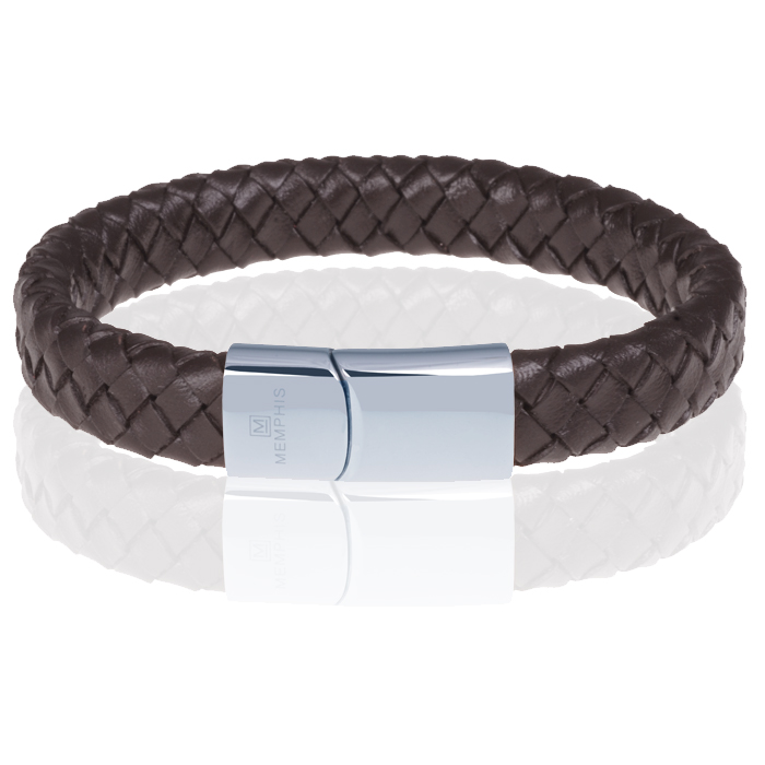 Memphis leren armband voor mannen. Deze lederen armband is van Nederlandse bodem en volledig met de hand gemaakt. Een brede strook gevlochten bruin leer van 5mm dik en 12mm breed gecombineerd met een gepolijste edelstaal sluiting. De sluiting schuift van boven naar beneden en is voorzien van een stevige magneet waardoor deze goed vast klemt. De armband is in verschillende maten beschikbaar. Wij verzenden de armband in een geschenkverpakking.