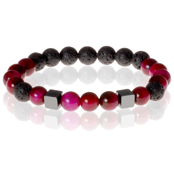 Kralen armband van Memphis vervaardigd uit natuursteen. De armband is uitgevoerd met paarse Tijgeroog kralen in combinatie met zwarte lavasteen kralen en twee Hematiet kralen. De kralen zijn 8mm breed. De armband is elastisch en geschikt voor een polsmaat van 18-21cm. Draag de armband los, samen met een horloge of combineer meerdere armbanden.