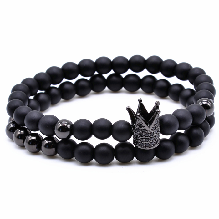 Kralen Armbanden Set van Memphis uitgevoerd met natuursteen, kroon en metalen kralen. De armbanden zijn uitgevoerd met 6mm Matte Agaat kralen en gelegeerde metalen kralen. De kroon is vervaardigd uit een metaallegering met zwarte PVD coating en glimmende zwarte zirkonia's. De armband is elastisch en geschikt voor een pols van 19-22cm. Draag de armband los, samen met een horloge of combineer meerdere armbanden.
