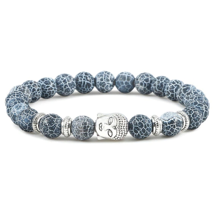 Memphis Kralen Armband uitgevoerd met Frosted agaat kralen en zilverkleurige Buddha. De armband is uitgevoerd met 8mm Frosted Agaat kralen en vier Tibetaanse kralen. De Buddha is vervaardigd uit een verzilverde metaallegering. De armband is elastisch en geschikt voor een pols van 18-22cm. Draag de armband los, samen met een horloge of combineer meerdere armbanden.