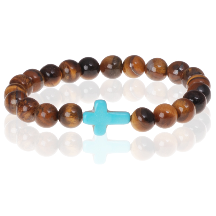 Memphis kralen armband uitgevoerd met Tigereye natuursteen en een Turquoise Kruis.