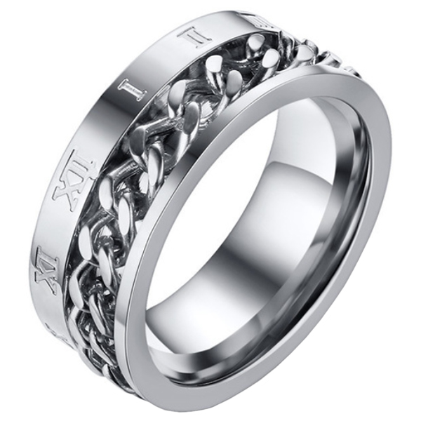 Mendes heren ring vervaardigd uit gepolijst edelstaal met Cubaanse schakelketting en Romeinse cijfers. De herenring is 8mm breed en weegt 9 gram. Ringen van edelstaal hebben geen onderhoud nodig en blijven lang mooi doordat het een hard en roestvrij metaal is.
