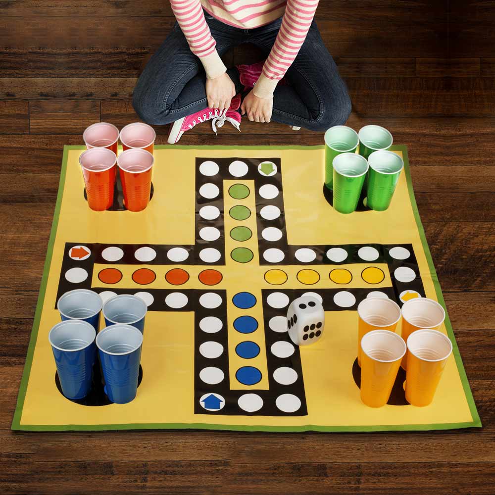 Het spelbord, in dit geval het vloerzeil, is 90 cm bij 90 cm groot en is gemaakt van plastic. De cups, ook wel bekend van de ‘Redcups’, bestaan uit 4 kleuren om zo ieder team zijn eigen kleur te geven. Laat ieder zijn/haar eigen cup vullen met hun favoriete drankjes en succes is verzekerd. Met dit Mens erger je niet XXL drankspel zorg je voor de gezelligste en fanatiekste spel- en drankavondjes en heb je een drank gezelschapsspel in huis die voor iedereen leuk is.