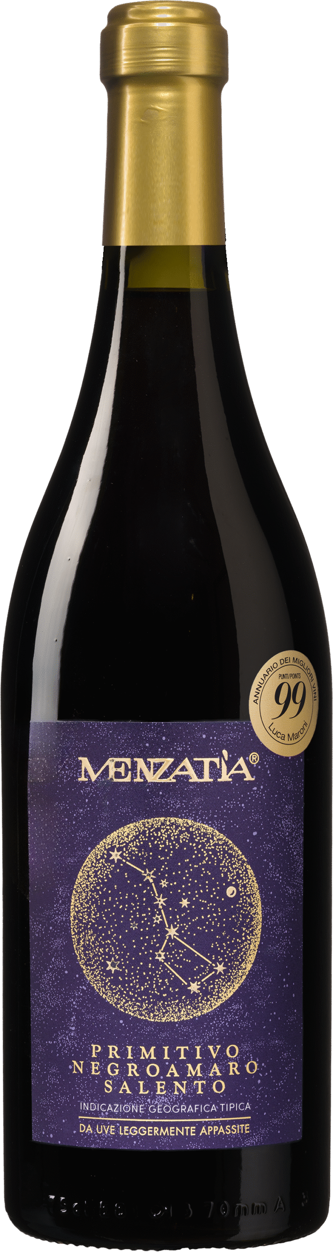 In deze Menzatia Primitivo-Negroamaro komt een aantal authentiek Italiaanse wijnmethoden samen. Allereerst de appassite- (ook wel appassito) methode, die ook wordt gebruikt bij het maken van de wereldberoemde wijn Amarone. Voordat de druiven voor deze wijn worden geperst, worden ze eerst te drogen gelegd. De druiven verliezen daarbij vocht en doen tegelijkertijd een waanzinnig geconcentreerde kracht op. Dat drogen gebeurt meestal in speciale kratten. Menzatia Vini kiest voor een andere techniek, ingegeven door het bijzondere klimaat in Salento. Dit schiereiland in Puglia is het best te vergelijken met een rots in zee, ingeklemd tussen de Adriatische Zee en de Ionische Zee. De zeewinden die er waaien maken het mogelijk dat de druiven, in dit geval de lokale helden primitivo en negroamaro, niet weggezet hoeven te worden in een kratje, ze drogen gewoon aan de stok. En met die stok is ook wat bijzonders aan de hand. Die zien er namelijk uit als een bonsaiboompje. Dat komt door de voor