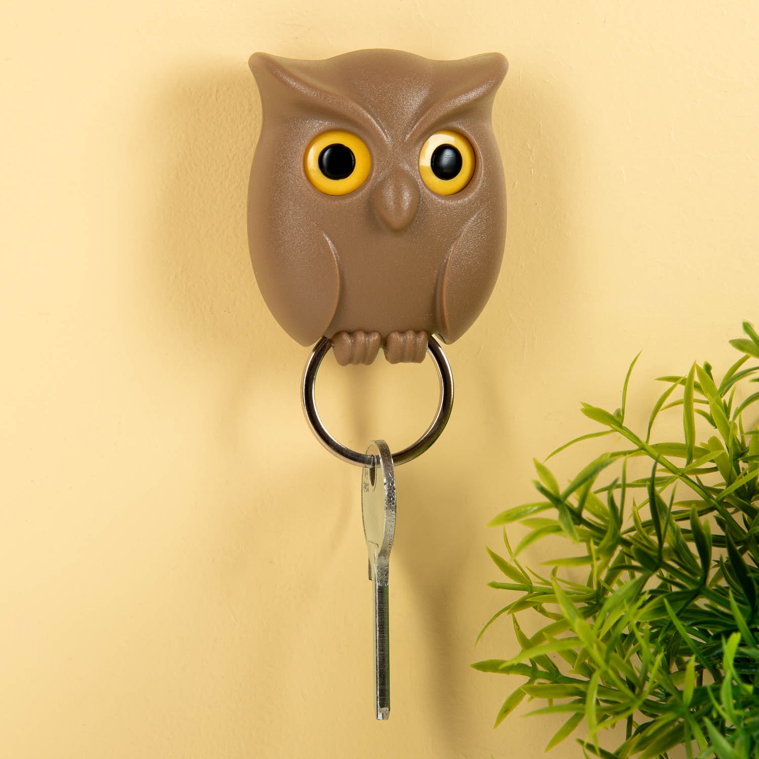 Nachtuil sleutelhouder van Qualy. Sleutelhouder in de vorm van een uil. Een vaste plek voor je sleutelbos. De uil let goed op, want zijn ogen blijven open als je je sleutels ophangt. Hoeft hij niet op te letten, dan sluit hij zijn ogen. De uil bevestig je eenvoudig aan de muur en je hangt je sleutels op aan de poten van de uil. Afmeting: 5,1 x 3,1 x 6,1 centimeter.