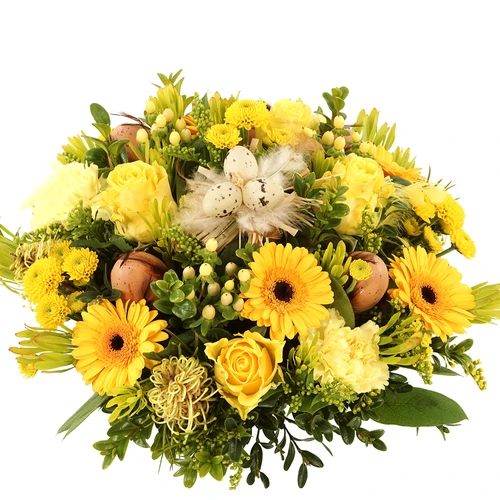 Paas bloemen bestellen en laten bezorgen voor Pasen. Deze paas biedermeier kunt u direct op tafel zetten.