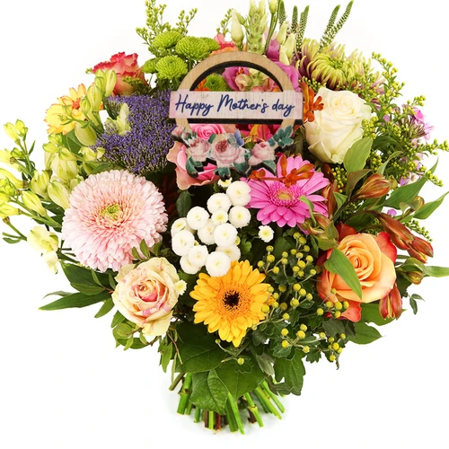 Pastel bont boeket + moederdag bijsteker