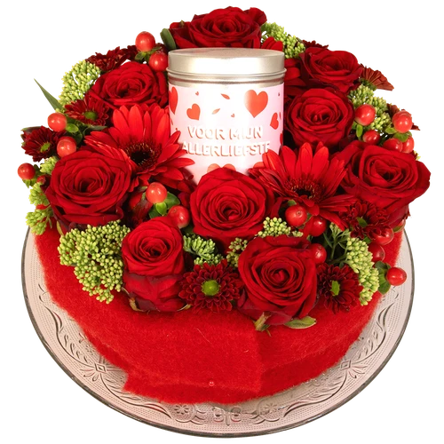 Bloemen voor de liefde in de vorm van een taart. Rode rozen en een blikje hartjes snoep met de tekst: ” Voor mijn allerliefste ”