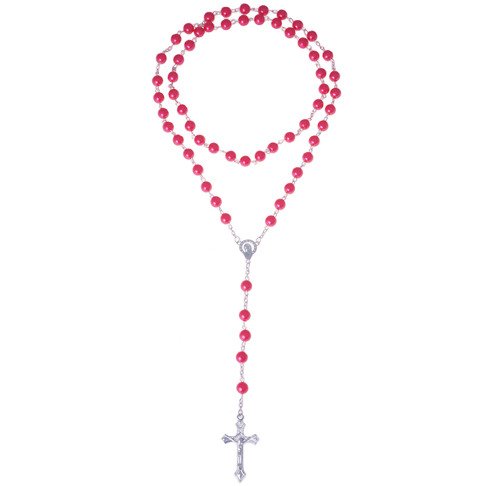Rozenkrans ketting met kruis hanger en Mariabeeld voorzien van 8mm rode ronde kralen. Het kruis is vervaardigd uit een verzilverde metaallegering en heeft een afmeting van 4.3 x 2.4cm. De rozenkrans heeft een een lengte van 80cm en wordt geleverd in geschenkverpakking.