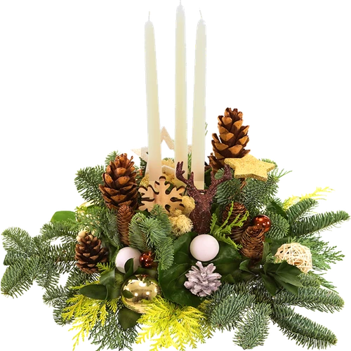 Bont kerststuk ca. Ø 35 cm met dikke gouden kaars