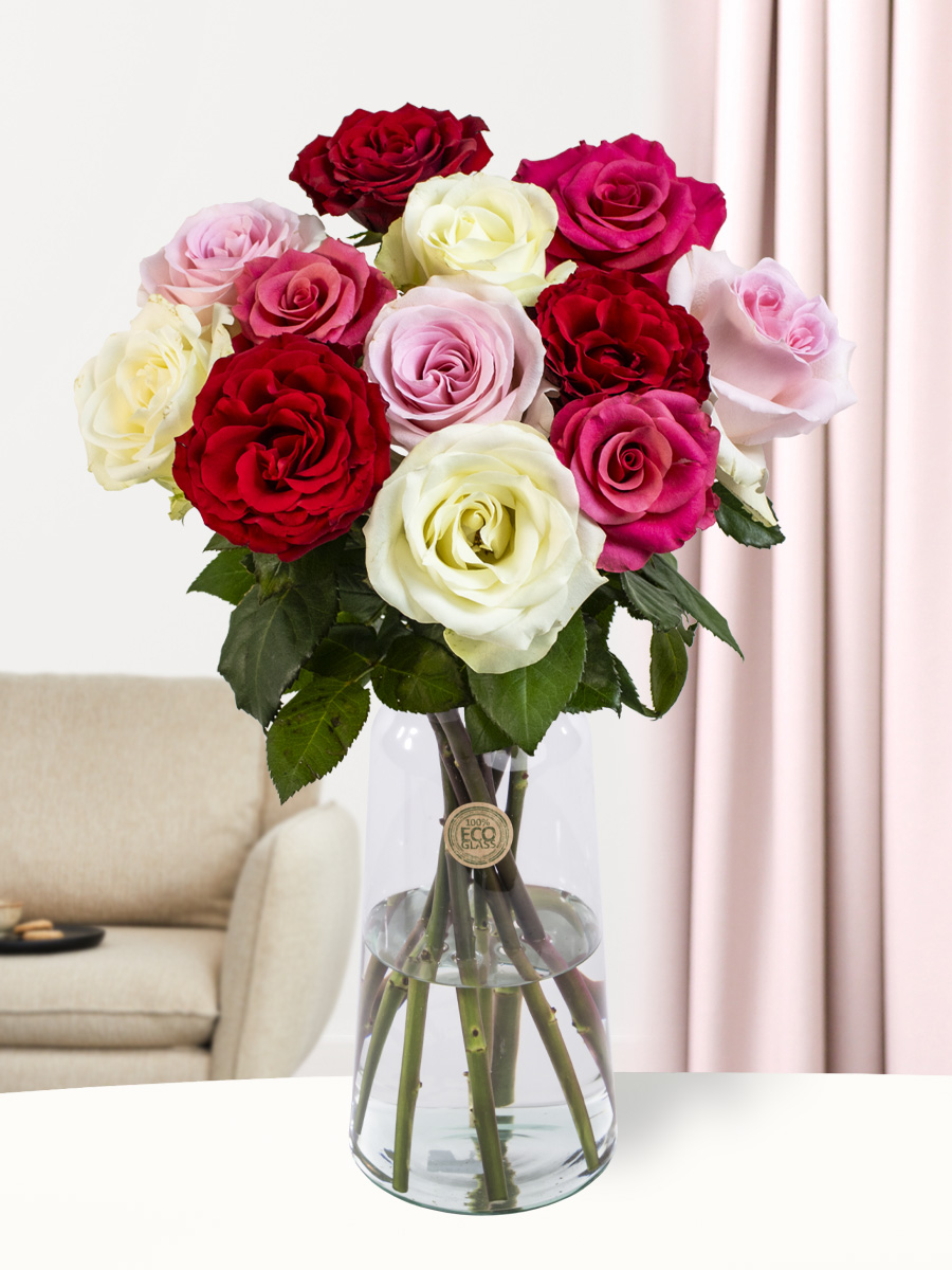 Dit rozenboeket is perfect om iemand een fijne verjaardag te wensen, iemand te bedanken of te geven aan iemand die belangrijk voor je is. De kleuren van de rozen stralen warmte en liefde uit, of dat nou in vriendschap is, of in relatie. Rode rozen mogen dan wel voor liefde staan, roze rozen staan voor dankbaarheid en witte rozen voor puurheid. Vergeet niet om een wenskaartje achter te laten, zodat de ontvanger weet waarom hij of zij dit kleurrijke boeket van jou krijgt!