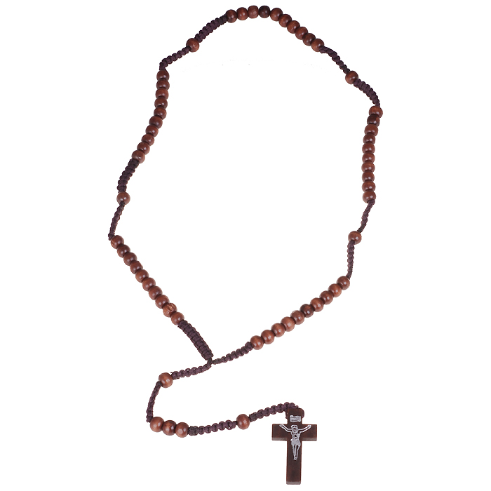 Rozenkrans vervaardigd met 8mm bruine houten kralen gecombineerd met gevlochten touw. Het houten kruis heeft een afmeting van 4 x 2.3cm. De rozenkrans ketting heeft een hoofdomtrek van 64cm. De bruine houten rozenkrans wordt geleverd in geschenkverpakking.