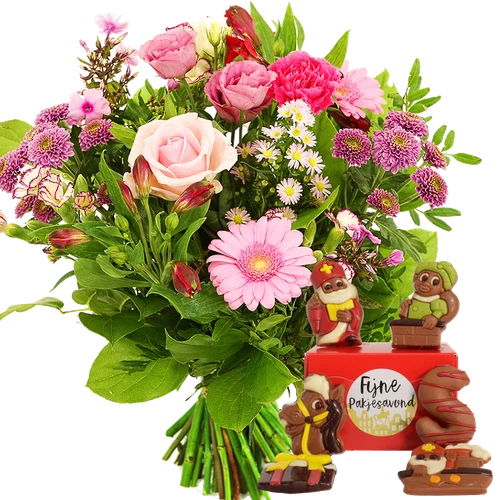 Een vers Sinterklaasboeket van roze seizoens bloemen en heerlijke Sinterklaas chocolade. Samen bezorgd in een luxe geschenkdoos. Thuiswinkel Lid.