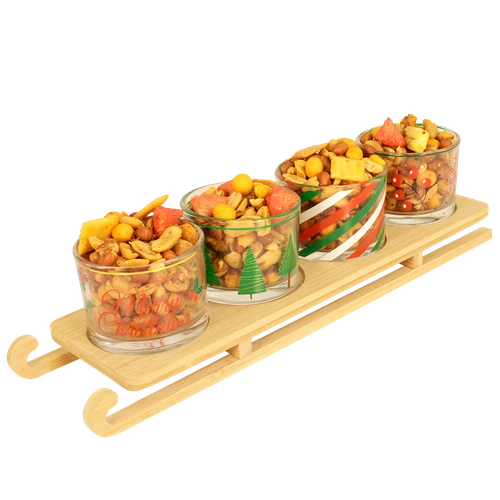 Een houten slee met 4 bedrukte glazen een prachtige serveerset geleverd met een heerlijke pikante borrelmix. Een mooi kerstgeschenk. Bestel op tijd.
