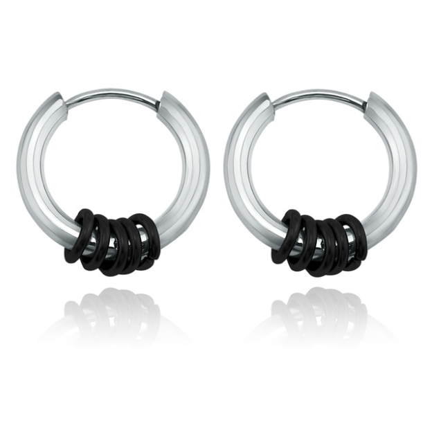 Zilverkleurige smalle creolen vervaardigd uit hoogwaardig chirurgisch edelstaal met vijf kleine zwarte ringetjes. De creolen zijn beschikbaar in diverse lengtematen en worden per set geleverd in geschenkverpakking.