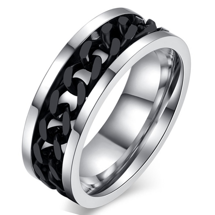 Herenring uitgevoerd in edelstaal met Cubaanse ketting in de kleur zilver met zwart. De Cubaanse ketting is uitgevoerd in edelstaal met zwarte PVD Coating. De herenring is 8mm breed en weegt 9 gram. Ringen van edelstaal hebben geen onderhoud nodig en blijven lang mooi doordat het een hard en roestvrij metaal is.