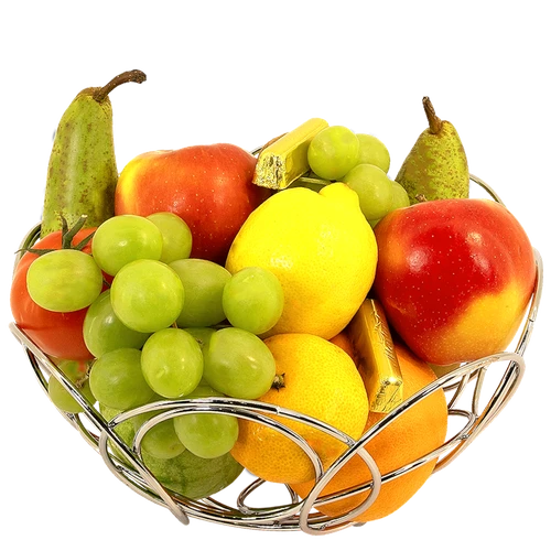 Een fruitmand vol met vers fruit en een luxe chrome fruitmand, den deze is her te gebruiken. Snelle bezorging. Bestel eenvoudig deze fruitmand.