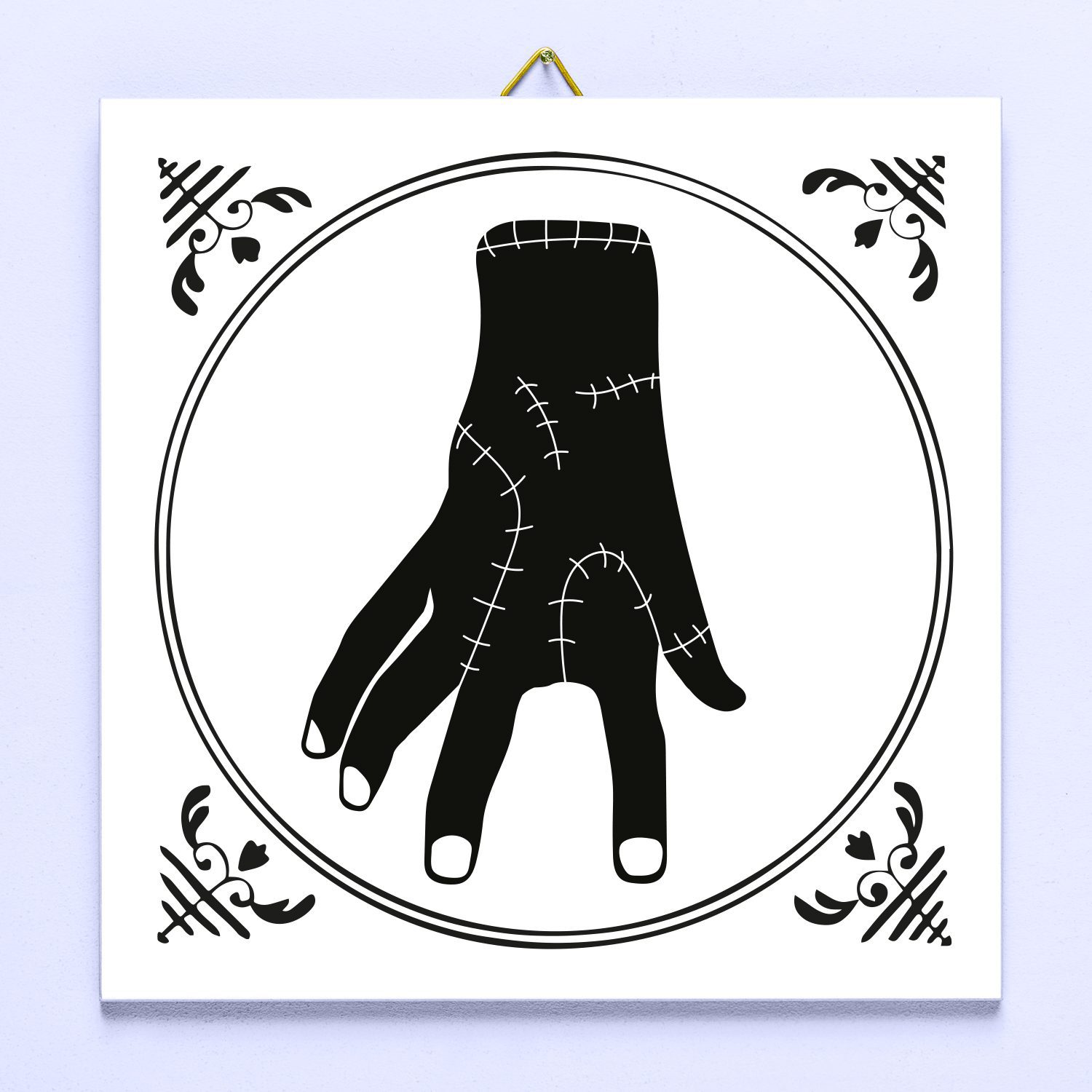 Tegeltje Thing Wednesday. Tegeltje met een illustratie van Thing zoals je hem kent uit de Netflix-hit Wednesday. Het tegeltje is van echt keramiek en wordt geleverd met een ophanghaakje. Het wordt bedrukt met hoge kwaliteit sublimatieprint. Afmeting: 15 x 15 centimeter.