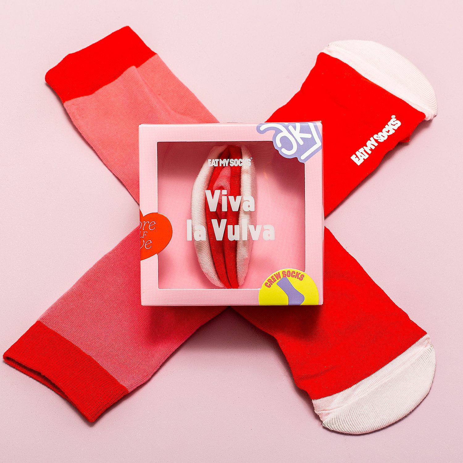 Viva la Vulva sokken van Eat My Socks. Sokken die er in de verpakking uitzien als een vulva. Deze sokken zijn een ode aan het vrouwelijk lichaam en Eat My Socks probeert mensen meer liefde voor zichzelf bij te brengen. In werkelijkheid bestaat de vulva uit één paar sokken, in verschillende tinten roze en rood. One size fits all. Gemaakt van katoen, polyester en elastaan.