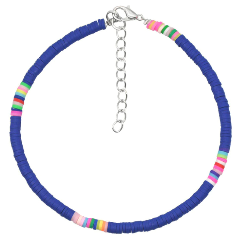 De enkelband is versierd met donkerblauwe kunststof kraaltjes van 4mm en vier rijtjes met gekleurde kraaltjes, wat bijdraagt aan de opvallende uitstraling.