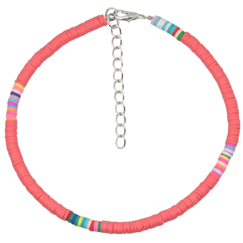 De enkelband is versierd met roze kunststof kraaltjes van 4mm en vier rijtjes met gekleurde kraaltjes, wat bijdraagt aan de opvallende uitstraling.