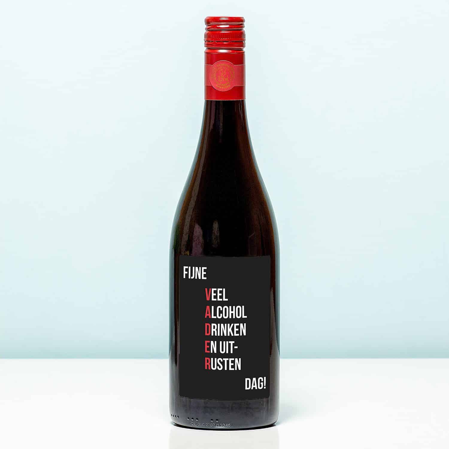 Wijnfles Fijne Vaderdag (Merlot). Fles rode wijn met de tekst Fijne Veel Alcohol Drinken En uit-Rusten (VADER) dag! De Merlot komt uit de Franse regio Pays d'Oc en heeft een uitbundige fruitsmaak met pruim, aardbei, dropachtig laurier, vanille en een fluwelen afdronk. Inhoud: 750 milliliter.