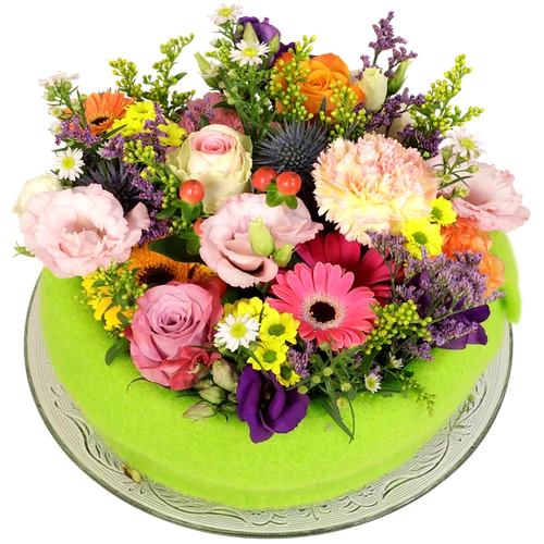 Een bloementaart met bloemen opgemaakt met wilde bloemen. De bloemen zijn ongelijk verwerkt in de bloementaart maar toch een gelijke bloemenaart. Bestel nu