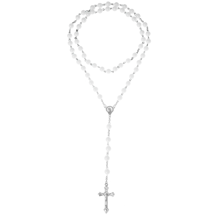 Rozenkrans ketting met kruis hanger en Mariabeeld voorzien van 8mm witte ronde kralen. Het kruis is vervaardigd uit een verzilverde metaallegering en heeft een afmeting van 4.3 x 2.4cm. De rozenkrans heeft een een lengte van 80cm en wordt geleverd in geschenkverpakking.