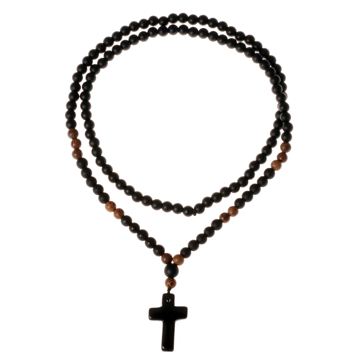 Zwarte natuursteen kralen ketting van Memphis met Kruis hanger. De kruis kettinghanger is vervaardigd uit zwart natuursteen en heeft een afmeting van 3 x 2cm. De ketting is vervaardigd uit Zwarte Matte Agaat kralen gecombineerd met bruine houten kralen geregen op een stevig koord. De ketting heeft een lengte van 70 cm en kan over het hoofd worden getrokken. De kralen hebben een afmeting van 6mm. Deze prachtige Memphis ketting wordt geleverd in geschenkverpakking.